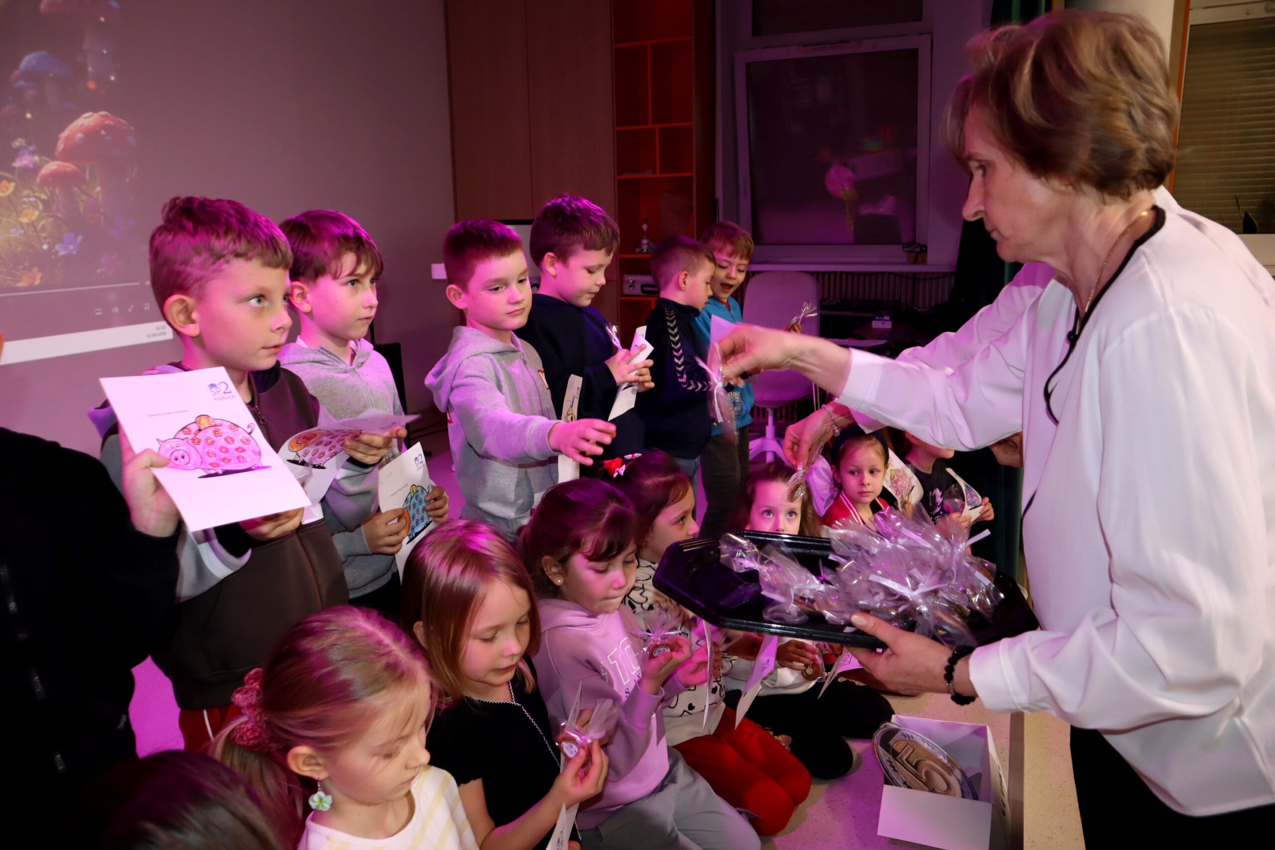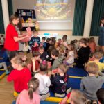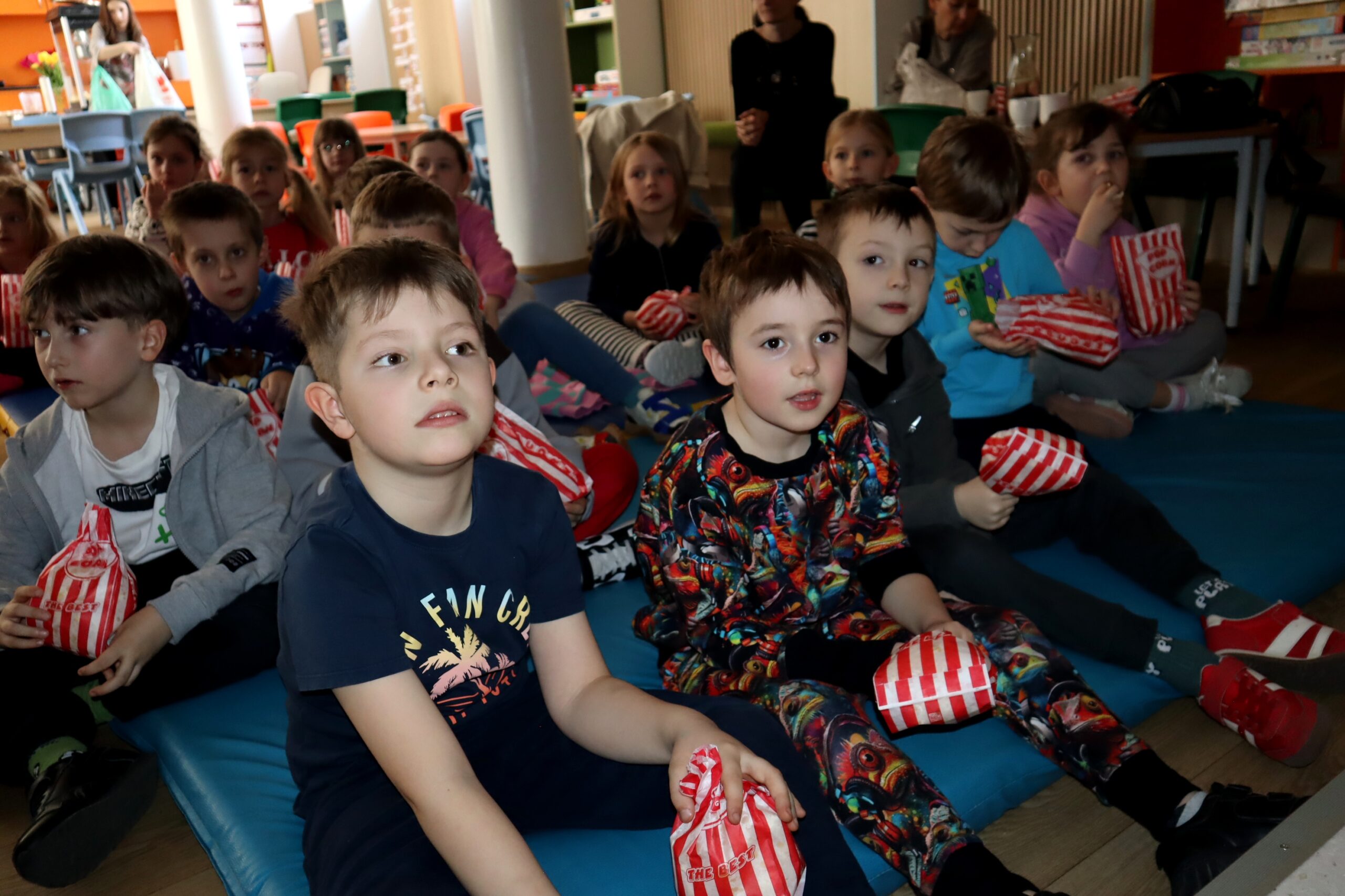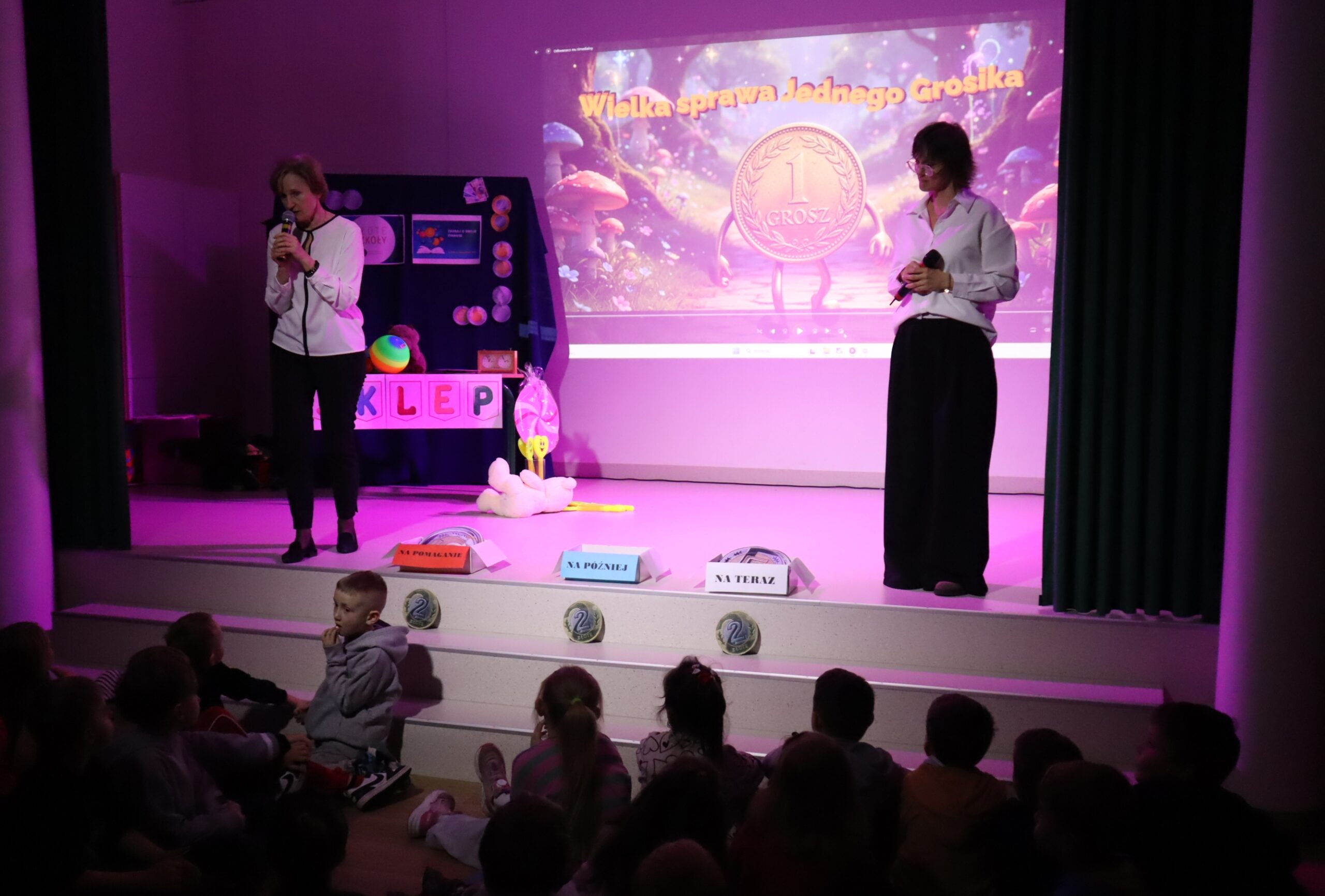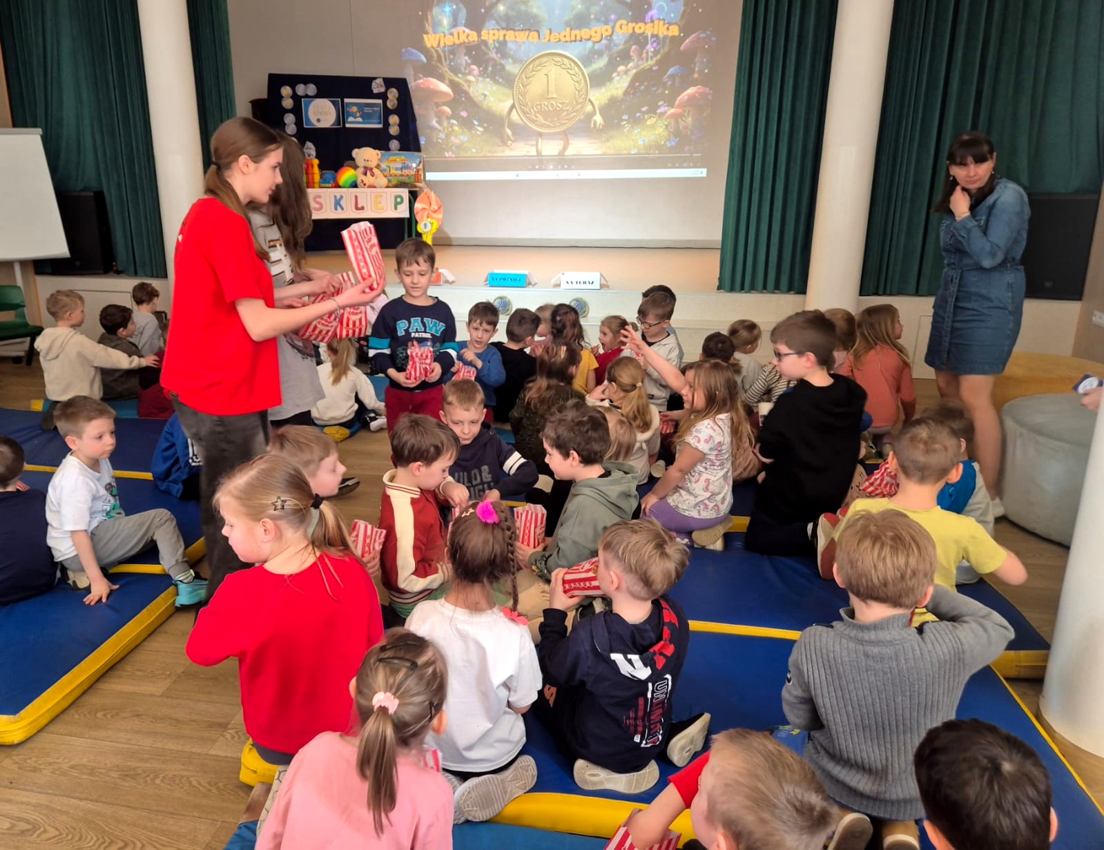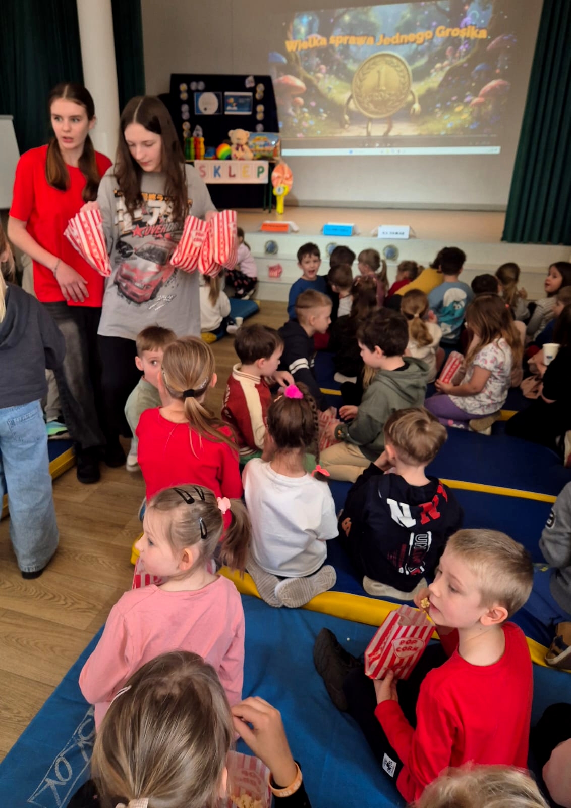 Po przedstawieniu przedstawienia dzieci odwiedziły nasze Radio SPDwójka, gdzie dowiedziały się, jak działa szkolna rozgłośnia i jaką pełni funkcję w życiu szkoły. Nie zabrakło również prawdziwych emocji – przedszkolaki uczestniczyły w nagrywaniu piosenki o oszczędzaniu, a następnie wzięły udział w seansie w naszym szkolnym kinie, gdzie przy lemoniadzie i popcornie obejrzały film poświęcony mądremu odkładaniu pieniędzy.