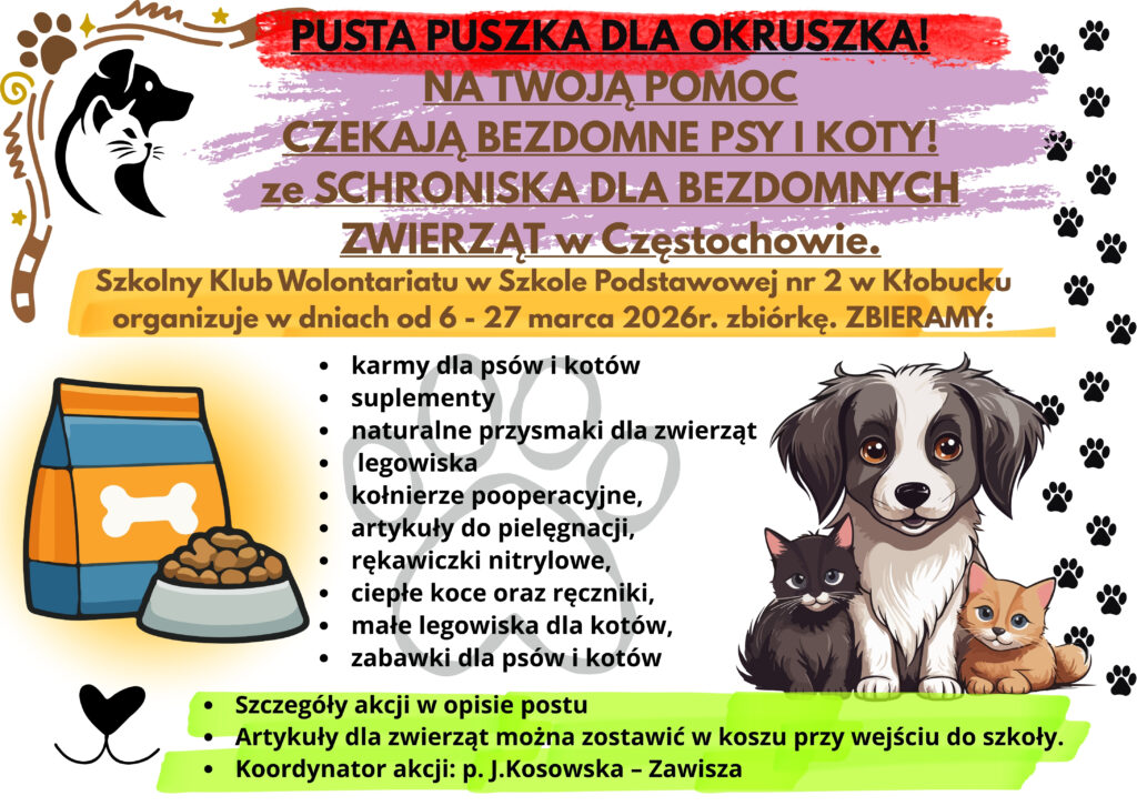NA TWOJĄ POMOC CZEKAJĄ BEZDOMNE PSY I KOTY!            Szkolny Klub Wolontariatu w Szkole Podstawowej nr 2 w Kłobucku organizuje w dniach od 6 – 27 marca 2026r. zbiórkę: karmy dla psów i kotów, bardzo mile widziana karma klasy premium oraz karma dla kociąt i szczeniąt (Brit, Farmina, Bosch, Animonda, Dolina Noteci, […]